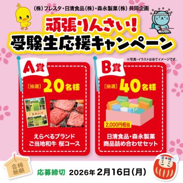 日清食品&森永製菓の商品を購入したレシートでキャンペーンに応募しよう! 抽選で合計60名様に1,000円分の豪華景品が当たる♪ 【レシート有効期間】2026年1月5日(月)~2月16日(月) 【応募締切】2026年2月16日(月)