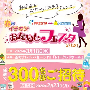 各メーカーの新商品・イチオシ商品をおためしできる大人気企画「おためしフェスタ」、今年も抽選で300名様をイベントにご招待いたします! 応募方法はフレスタアプリ・Instagramの2通り。 皆様のご応募お待ちしております♪ 【応募締切】 ※応募方法毎に異なります※ ●アプリ応募:2026年2月1日(日)~2月23日(月) ●Instagram応募:2026年2月1日(日)~2月15日(日) 【イベント開催日時】2026年3月18日(水) 10:30~20:00 (※第1部:10:30~12:30 第2部:13:30~15:30 第3部:17:30~20:00)