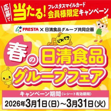 フレスタスマイルカード会員様限定キャンペーン! フレスタで日清食品グループの商品を買って豪華景品を当てよう♪ またフレスタ公式Instagramでは日清食品グループの商品を使ったアレンジレシピを順次公開予定! こちらもお見逃しなく! 【キャンペーン期間】2026年3月1日(日)~3月31日(火)