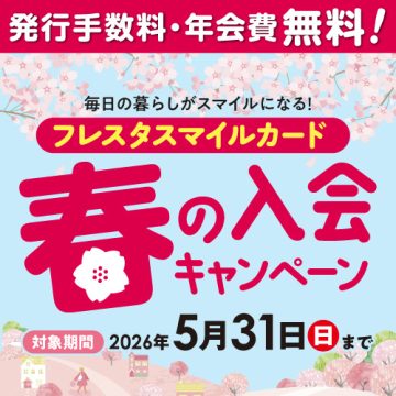 入会するなら今がお得!!/ フレスタスマイルカード 春の入会キャンペーン実施中♪ 期間中は発行手数料・年会費が無料! 【キャンペーン期間】2022年3月1日(火)~5月31日(火)