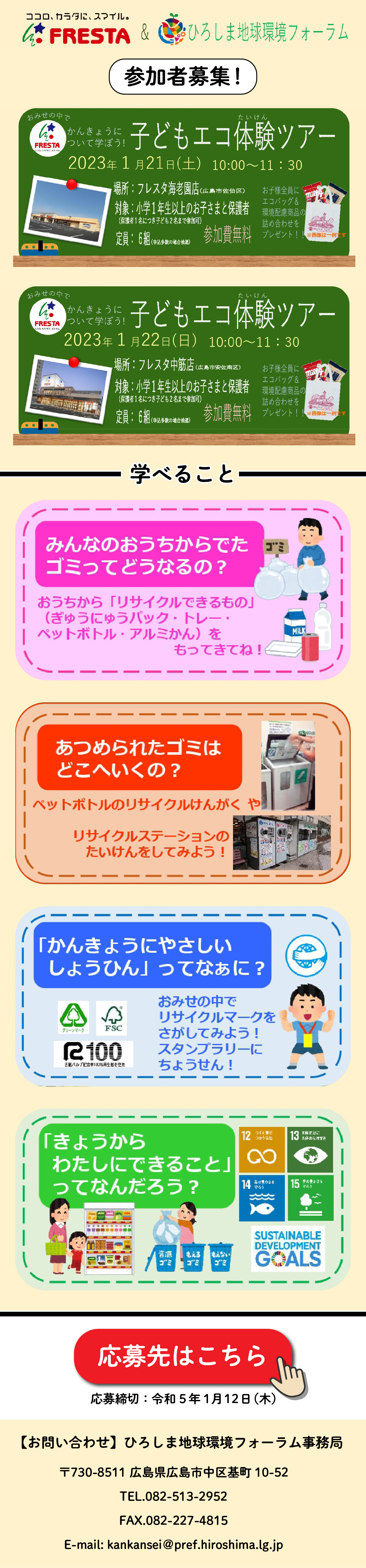 フレスタと「ひろしま地球環境フォーラム」のコラボ企画!お子様を対象に”環境について学べる”体験ツアーを開催します♪お子様全員にエコバック&環境配慮商品の詰め合わせをプレゼント!!