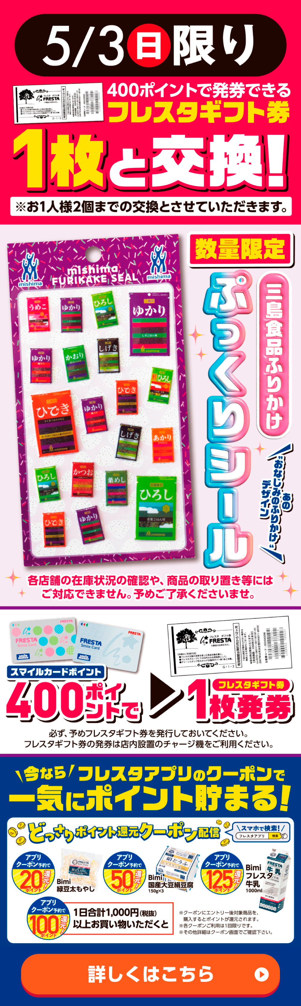 【5/3(日)限り】フレスタギフト券1枚と交換★三島食品ふりかけ・ぷっくりシールをGETしよう♪