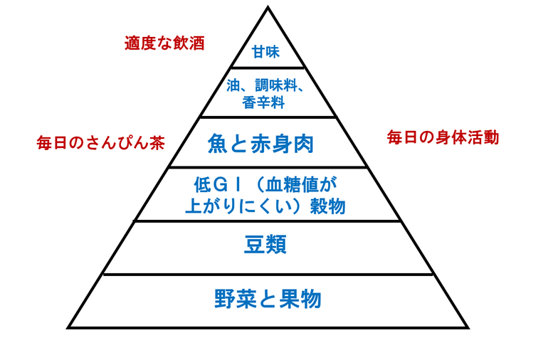 このフードピラミッドの説明では、「主食のサツマイモ、緑黄色野菜もしくは根菜、毎食添えられる大豆食品(豆腐、味噌汁ほかの料理)が食事の土台」としているので、一番下の「野菜と果実」の中には、大豆はじめとする豆類も含んでいると考えられる。ピラミッドの周囲にある項目は、食事(食品)以外の重要な要素。