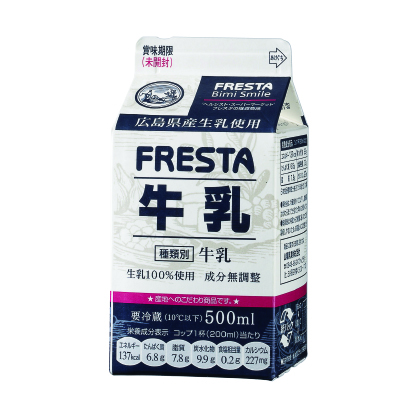 一般的な牛乳は、全国各地から集められた生乳をブレンドして作られているのに対して、このBimi Smile「フレスタ牛乳」は産地を広島県内に限定した生乳を使用しているのが最大の特長です。 産地を限定することにより、良質な生乳を安定的に確保できることはもちろんのこと、使用された生乳が広島県内どこの酪農家で搾乳された生乳かという生産者履歴も追跡可能です。 さらに、広島県内で生産された生乳を産地より車で約1~2時間の広島県内工場で製品化しているので新鮮なまま、安心・安全な牛乳を毎日食卓に届ける事ができます。 また、年間を通じて乳脂肪分3.5%以上、無脂乳固形分8.5%以上の良質な生乳を、季節によって変化する乳成分をそのままに製品化した、成分無調整牛乳であることも特長のひとつとなっています。