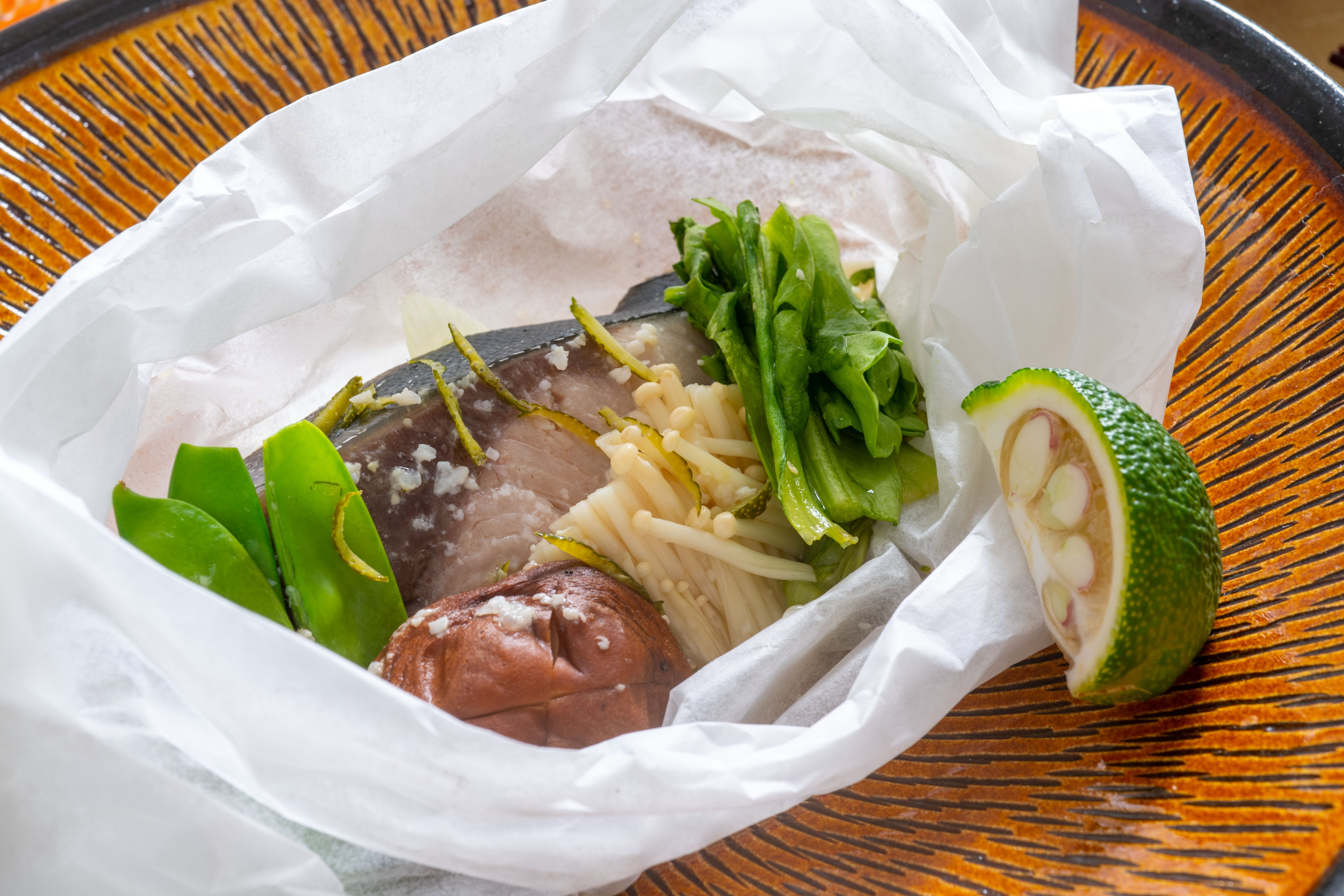 お皿に盛り付け、クッキングペーパーの口を開け、お好みでさらに柚子を絞る。