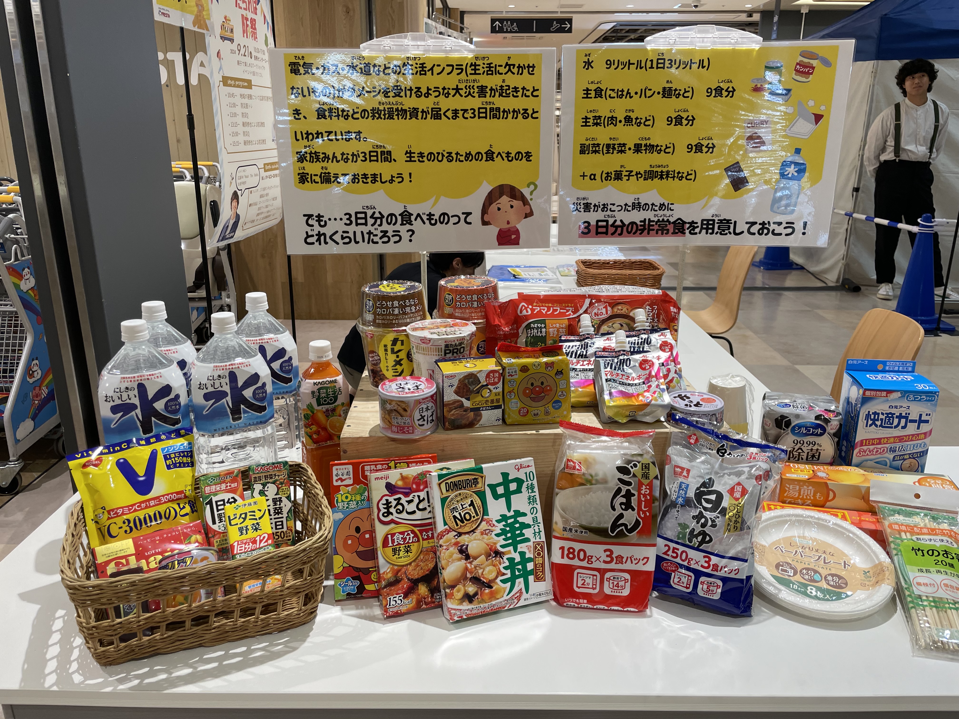 フレスタのブースでは、スーパーでそろう備蓄品の展示やワークショップ「ゴミ袋でレインコート作り」などを行いました。