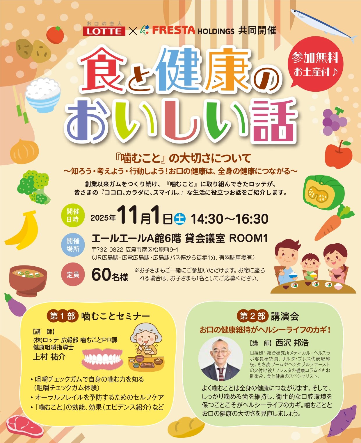 創業以来ガムをつくり続け『噛むこと』に取り組んでこられたロッテさまと共同し、2025年11月1日(土)広島駅周辺にて、健康セミナー「食と健康のおいしい話~『噛むこと』の大切さについて~」を開催しました。