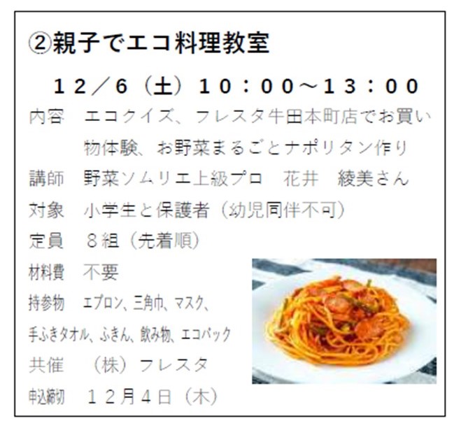 世界的な社会問題となっている「食品ロス」を減らすために、私たちが今日からできる取り組みについて、エコ料理教室を通して学び、一緒に考えるイベントです。