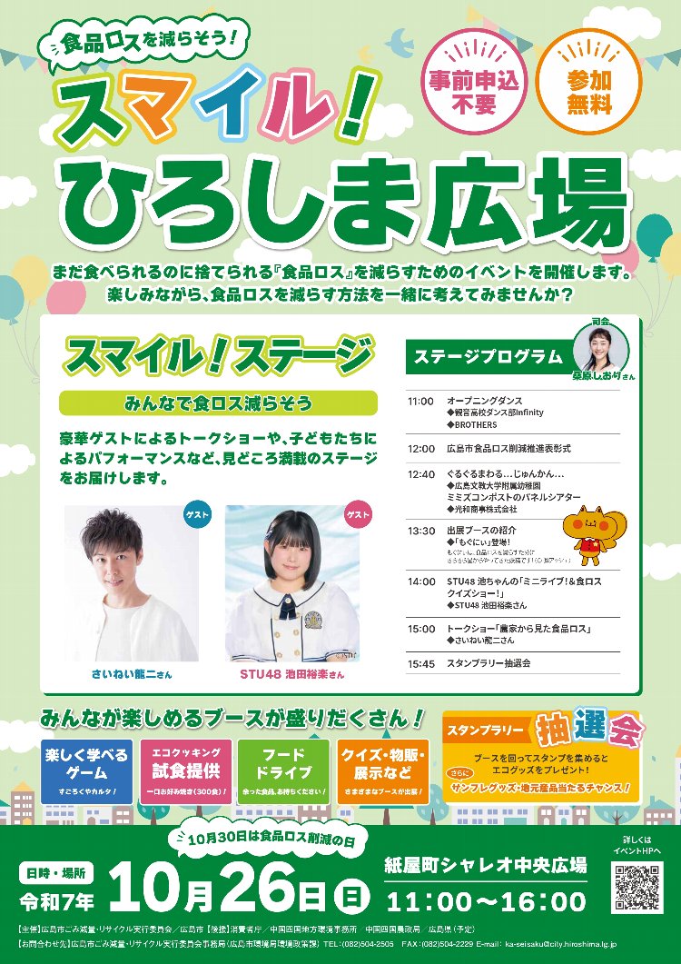 広島市で構成する広島市ごみ減量・リサイクル実行委員会では、「食品ロス削減の日」付近に食品ロス削減イベント「スマイル!ひろしま広場」を開催しており、2026年度は紙屋町シャレオ中央広場にて10月26日(土)に開催されました。