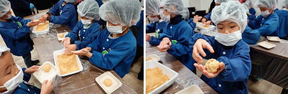 隣接する惣菜工場フレッシュセブンから材料直送!お店に並んでいるおはぎと同じ材料を使って、園児の皆さんでもペロリと食べられる特製ミニサイズです🥰